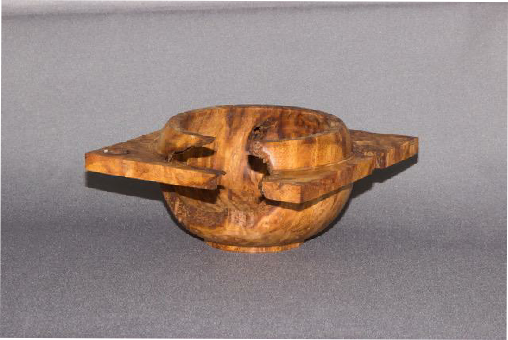 I was given a small stump about two years or so ago by someone who did not know what the tree was, but thought it was a fruit tree and would have interesting grain. I had my doubts. I rough turned it and then wrapped it in newspaper and left it for a year or more. This year when turning it weak and rotted bits and knots fell off and left holes, some of which I patched with Milliput, which I found helped hold the remains together. I nearly gave up on it several times but made something of it in the end.