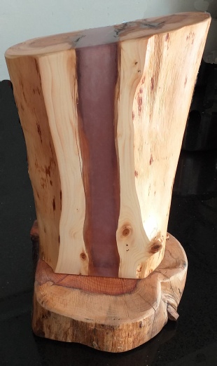 A table light, split yew log, filled with resin, then routed flat and sanded to 2500 grit.