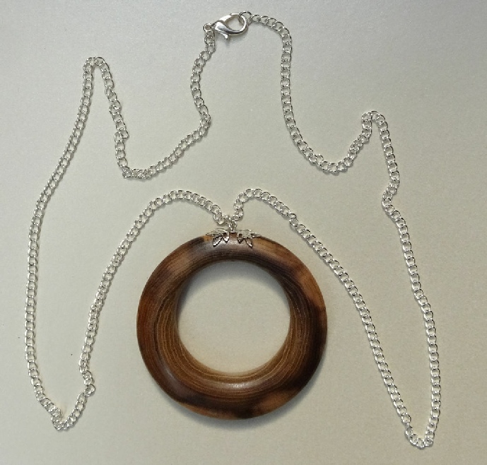 Brian Partridge has made a ladies pendant using a grot piece of wood and the off centre jig made from a kit supplied by Paul Howard