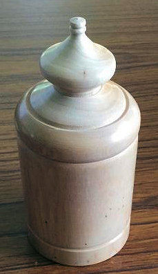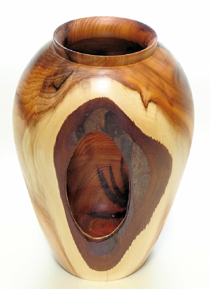 Brian Partridge ended with a hole in the side of this pot made from an irregular piece of Yew. This means that once you have opened the hole the shavings all come out on their own. It also means that other turners can see what a mess the inside turning is. H 160mm