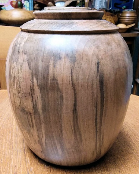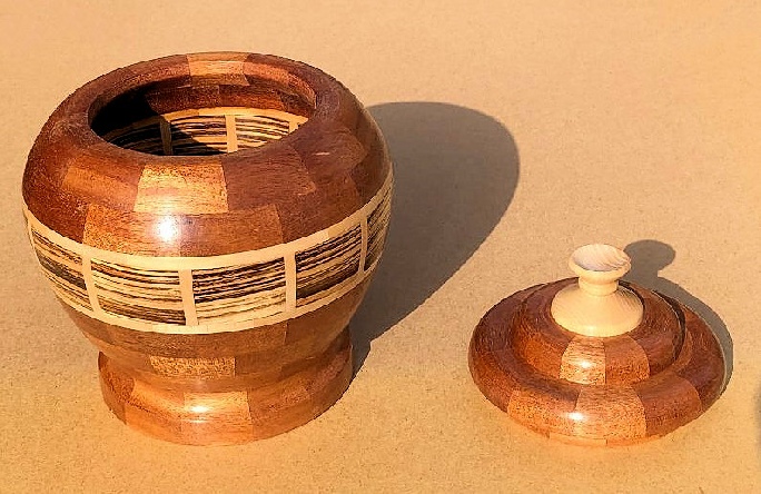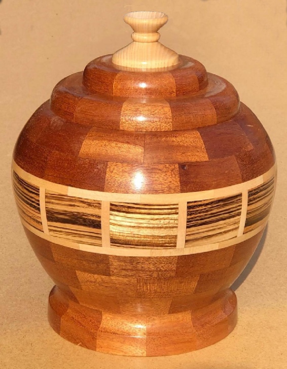 My latest offering Lidded vase in Mahogany with tulipwood and Zebrano feature ring and Ash knob. 8” diameter 10”high 157 pieces